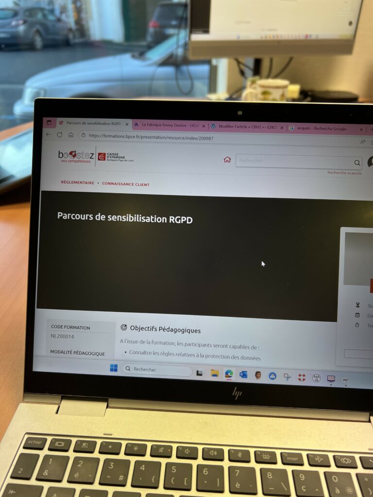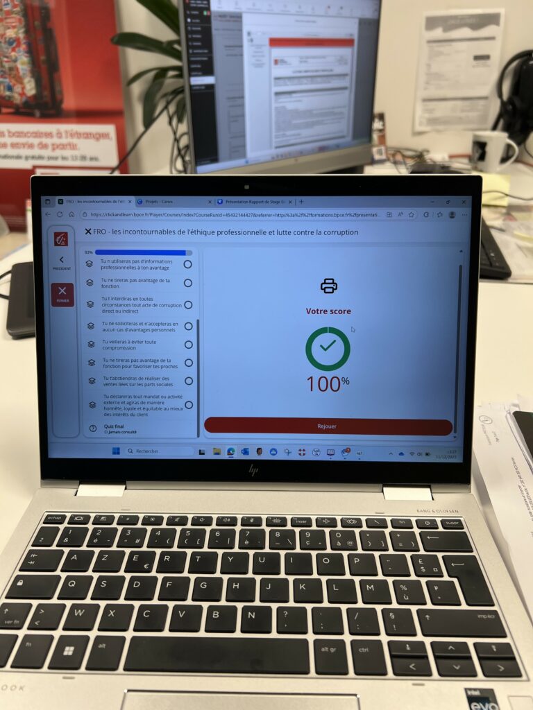 L’après-midi, j’ai accompagné Seychelle. La Caisse d’Épargne met à disposition des collaborateurs des formations digitales comprenant des vidéos explicatives et des quiz. Grâce à l’ordinateur qui m’a été prêté, j’ai pu tester ces modules et évaluer les connaissances acquises au cours de ces deux semaines de stage. Ces formations portaient sur plusieurs thématiques liées à la banque, aux assurances, ainsi qu’à la réglementation et à la sécurité des données, notamment le RGPD, déjà abordé en cours.